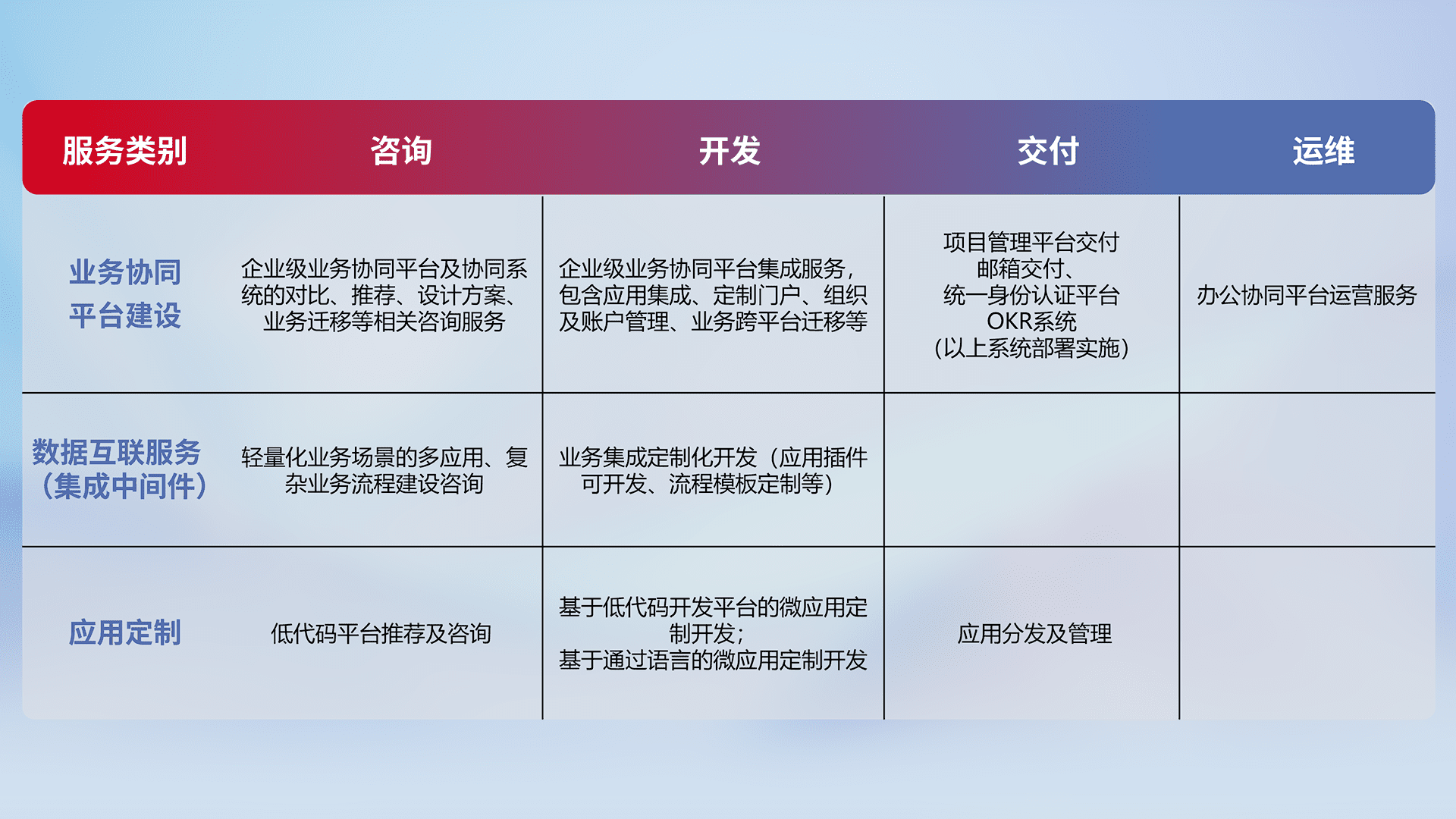 针对钉钉、、企微、、IDaas等平台级产品提供产品的规划、、方案、、交付、、定制化开发等服务,,实现如统一协同办公、、智能客户服务、、、混合会议管理、、、、智能数据查询、、等业务场景,,,,实现数字化转型。。