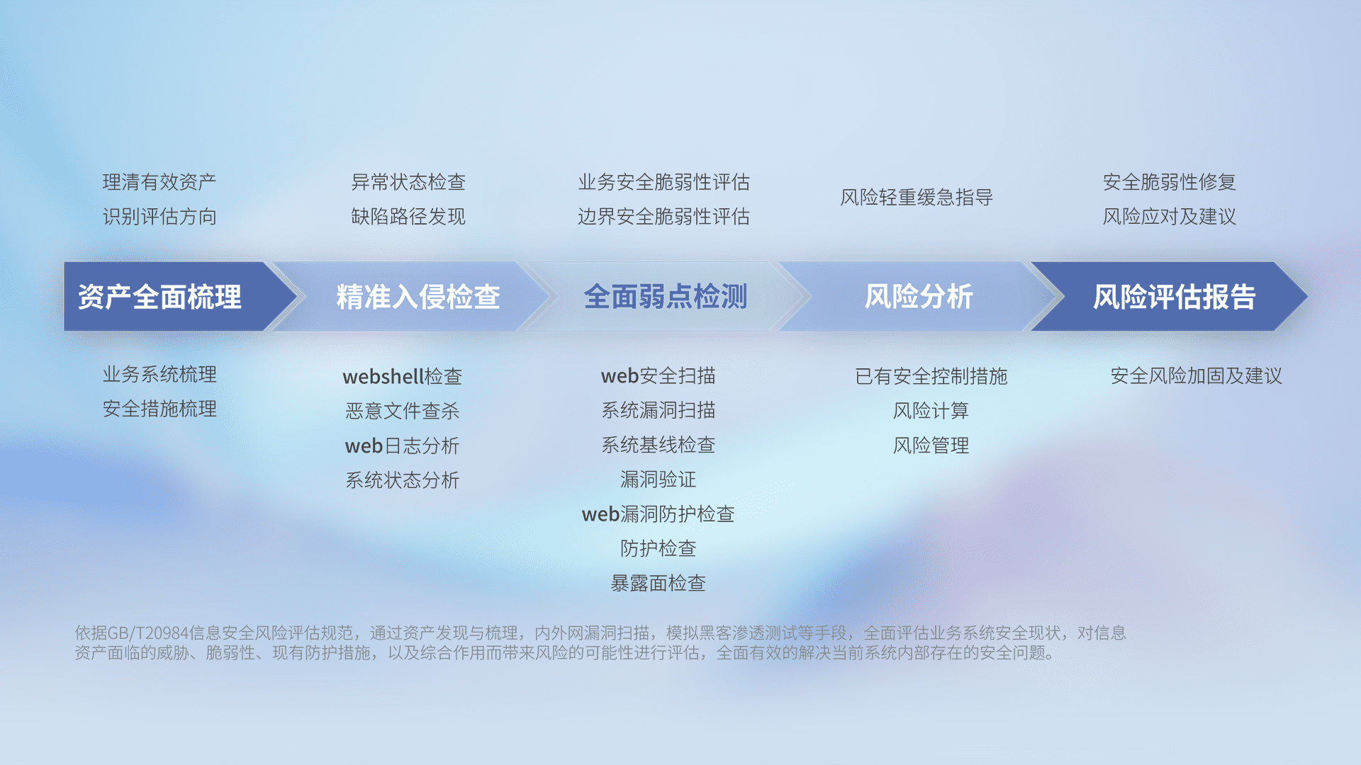 针对客户行业特性,,,,以专业的安全服务+多厂商联合解决方案提供专属的一站式安全管理服务,,,帮助客户全面感知网络空间威胁,,,,基于识别、、、、检测、、分析、、防护、、监测、、响应的服务理论模型,,从方案咨询、、集成交付、、评估验证、、优化加固、、、、运维运营,,,,致力于为客户提供完整的闭环管理式安全服务。。。。以实战经验为客户打造高抵御风险的安全体系,,,帮助客户发现威胁、、、、对抗威胁、、处置威胁,,不断积累安全对抗能力,,,,持续保障数字化安全。。